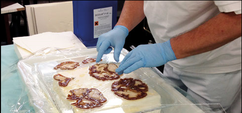 3、器官和軀體的塑化薄片是非常好的橫斷面解剖學(xué)教學(xué)材料,這個(gè)領(lǐng)域的重要性日益顯現(xiàn),其與 X 片有很好的相關(guān)性。半透明尸體連續(xù)切片在各種科學(xué)研究方法中非常有用。此外,因?yàn)槠淇蛇M(jìn)行整個(gè)器官和器官切片的快速宏觀診斷檢查,在病理學(xué)上可適當(dāng)輔助診斷??捎贸R?guī)組織學(xué)方法選擇性分析病理修飾的組織區(qū)域。