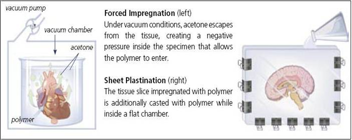1、塑化方法基于采用一種活性聚合物如聚硅氧烷橡膠、環(huán)氧樹脂或者聚 酯樹脂取代組織中的水和脂肪。首先,通過冷凍替代法置換組織中的水,然后在室溫下,用丙酮逐步取代組織脂肪。之后將脫水脫脂的標(biāo)本放入聚合物溶液。在真空條件下,將溶劑以氣態(tài)持續(xù)從標(biāo)本中抽出,產(chǎn)生負(fù)壓,使得聚合物逐漸進(jìn)入組織中。采用這種被動(dòng)浸漬工藝,根據(jù)其采用的聚合物的不同,標(biāo)本被氣體、光或熱固化。