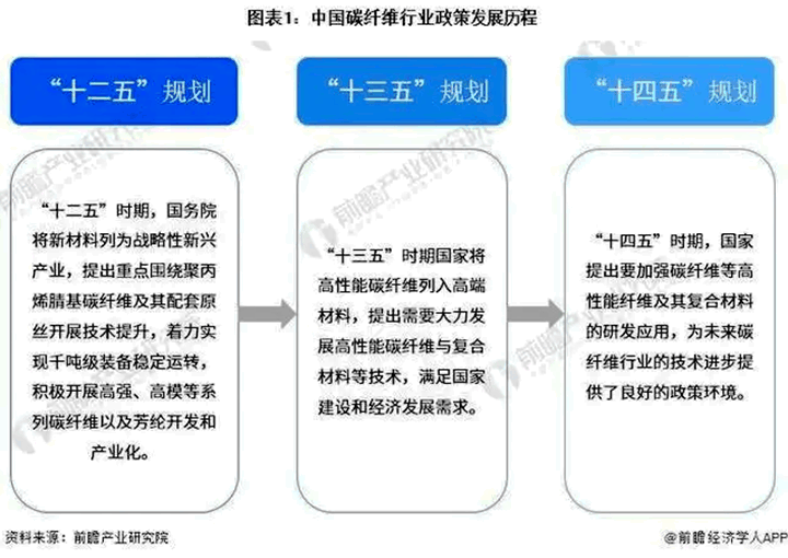 “十二五”規(guī)劃提出重點(diǎn)圍繞聚丙烯氰基碳纖維技術(shù)開(kāi)展技術(shù)提升;“十三五”規(guī)劃時(shí)期將高性能碳纖維列入高端材料;“十四五”規(guī)劃提出要加強(qiáng)碳纖維等高性能纖維及其復(fù)合材料的研發(fā)應(yīng)用,為未來(lái)碳纖維行業(yè)的技術(shù)進(jìn)步提供了良好的政策環(huán)境。