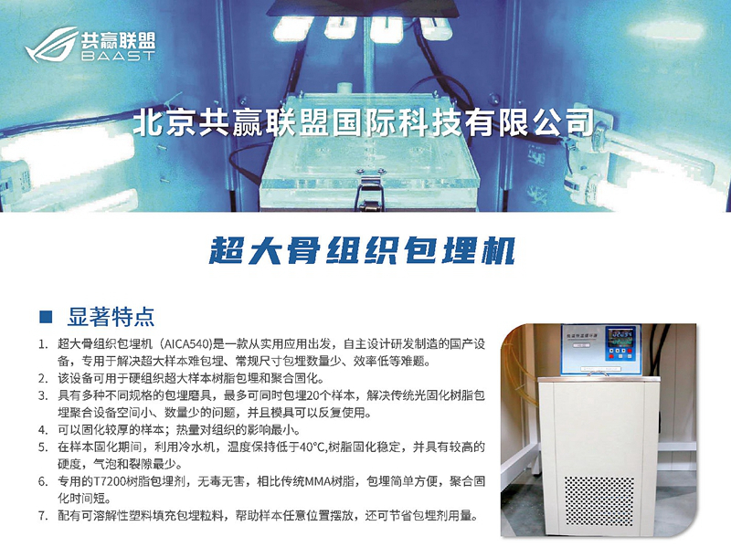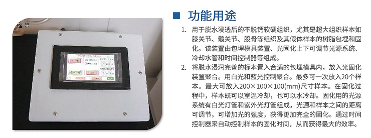 用于脫水浸透后的不脫鈣軟硬組織,尤其是超大組織樣本如膝關(guān)節(jié)、髖關(guān)節(jié)、股骨等組織及其假體樣本的樹脂包埋和固化。該裝置由包埋模具裝置、光固化上下可調(diào)節(jié)光源系統(tǒng)、冷卻水管和時(shí)間控制器等組成。