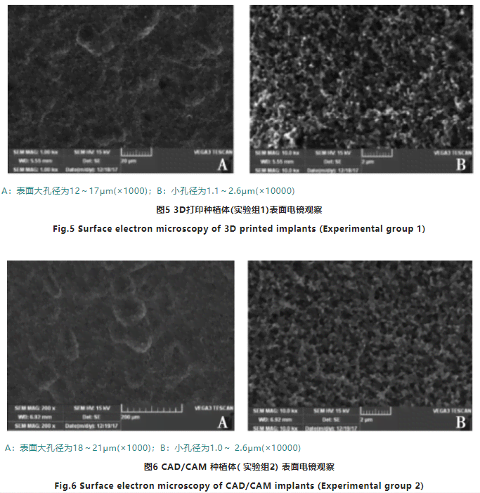 1.2.1 兩組氧化鋯種植體植入前表面處理3D打印氧化鋯種植體和CAD/CAM氧化鋯種植體植入前采用顆粒尺寸為250μm 的Al2O3粒子,噴砂力度0.8MPa,距離18mm,垂直噴砂4個(gè)循環(huán),40%氫氟酸60℃酸蝕60min,蒸餾水超聲震蕩干燥后采用掃描電鏡對(duì)3D打印氧化鋯種植體和CAD/CAM氧化鋯種植體表面形貌進(jìn)行顯微觀(guān)察。