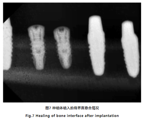術(shù)后離體的Beagle犬脛骨經(jīng)便攜式X線(xiàn)機(jī)拍照,得到種植體植入的骨界面愈合情況(圖7) 。種植體和周?chē)墙M織嵌合緊密無(wú)間隙存在,螺紋均位于骨平面以下,光滑面均位于脛骨骨皮質(zhì)外,植體植入方向與骨面垂直,植體之間的間距在2~3 mm,植體周?chē)匆?jiàn)異常透射影像。三組種植體的成功率均為100%。