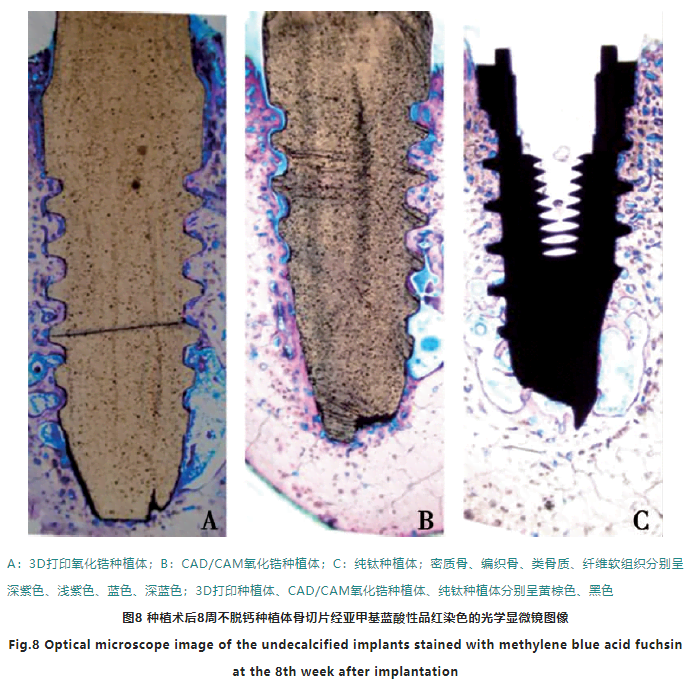 2.4 亞甲基藍(lán)-酸性品紅染色、骨接觸率測(cè)定(圖8)為種植體植入8周后,3D打印氧化鋯種植體、CAD/CAM氧化鋯種植體和純鈦種植體的亞甲基藍(lán)酸性品紅染色圖。亞甲基藍(lán)酸性品紅染色可清晰顯示新舊骨組織邊界和成骨細(xì)胞,便于區(qū)分軟硬組織。圖中可看到紫紅色的是骨小梁,藍(lán)色的是間質(zhì)。新生的編織骨較疏松,染色較深紫色;密質(zhì)骨為淺紫色,骨小梁間的纖維網(wǎng)狀結(jié)構(gòu)為淺藍(lán)色,纖維軟組織呈深藍(lán)色,藍(lán)色為類(lèi)骨質(zhì)。另外,位于螺紋表面可以看到較粗的新生骨小梁。3組種植體不含骨髓腔骨結(jié)合率、含骨髓腔骨結(jié)合率、平均骨接觸率和種植體周?chē)敲芏葦?shù)值如(表1)所示,差異均無(wú)顯著性(P>0.05)。